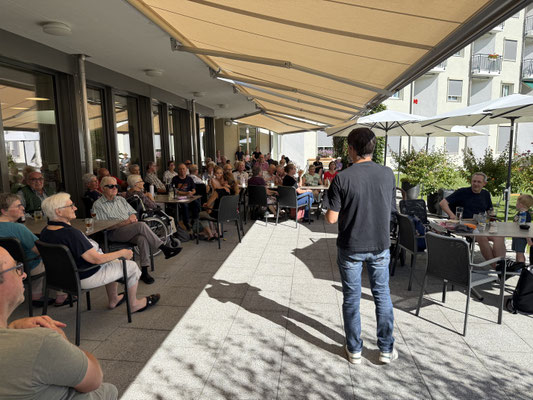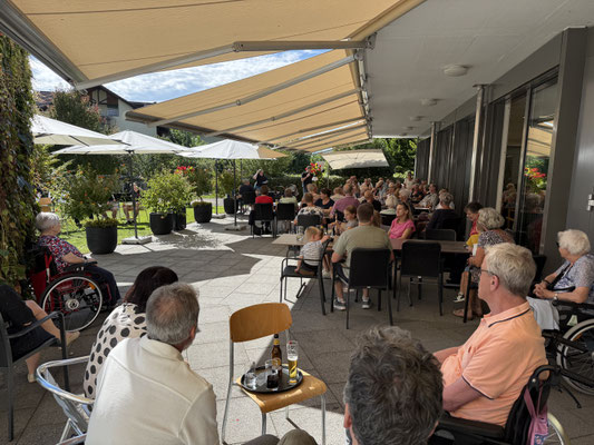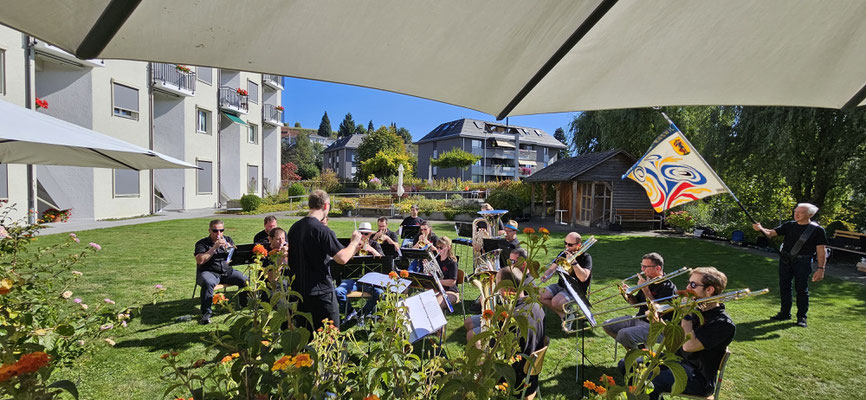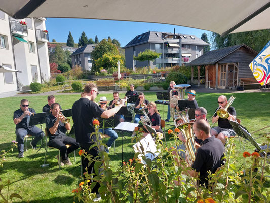Bei schönstem Spätsommerwetter und gut besetzter Terrasse spielten wir für unsere geschätzten Ehrenmitglieder und die Bewohner / Bewohnerinnen des Alterswohnzentrums Ruswil das traditionelle "AWZ-Ständli". Gestärkt von Kaffee und Kuchen stand einem unterhaltsamen Freiluft-Auftritt nichts im Weg, um die Jubilierenden Ehrenmitglieder und Bewohner gebührend feiern zu können.